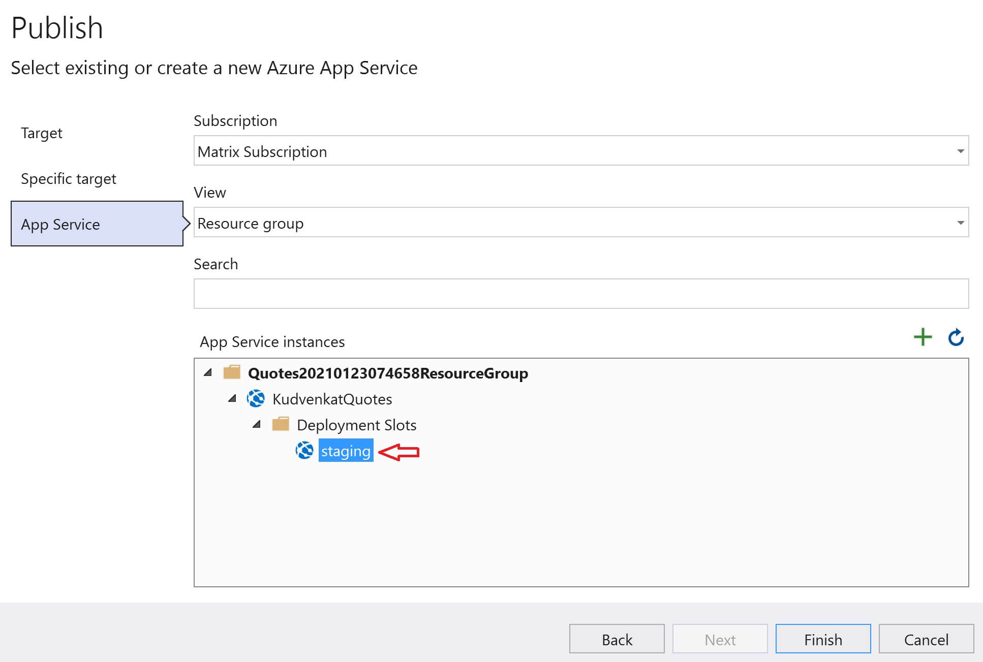 In Visual Stduio, right click on the project name in the Solution Explorer and select Publish to get to the Publish window. This publish page allows you to create several Publish profiles. At the moment, I already have a Publish profile that allows me to deploy directly to the Production slot in azure.